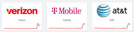 The attached image above was pulled from Downdetector (downdetector.com) a few minutes ago and shows near-identical surge curves across Verizon, T-Mobile, and AT&T within the same window.