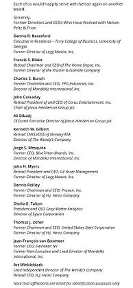 Trian releases letter this morning for Disney $DIS investors - says the following list of former executives and directors “. . .would happily serve with Nelson again on another board”