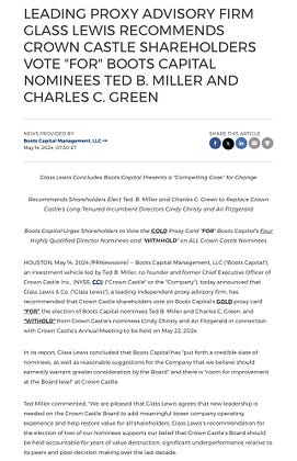 Glass Lewis recommends shareholders vote FOR two dissident nominees in proxy contest at Crown Castle Inc. $CCI