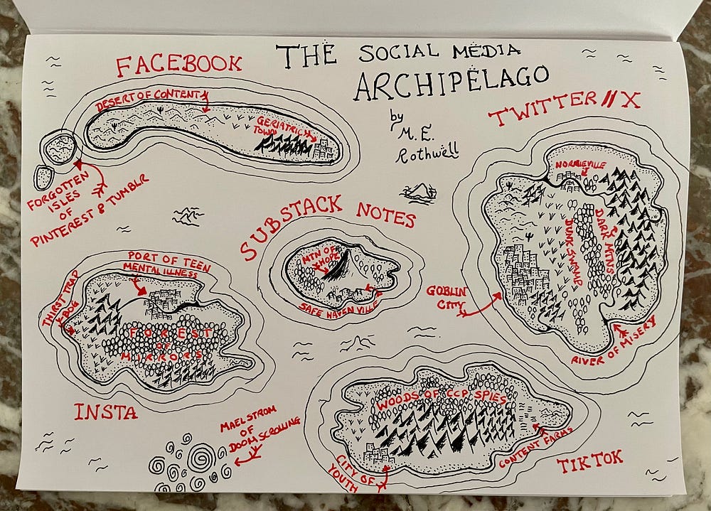Instead, look toward the lone peak of innocent hopes, reminiscent of the heady days of the early internet, where healthy conversation and good faith debate may yet flourish. Look to the terra novalis, known to the early cartographers as the mythical land of Substackus Notum.
