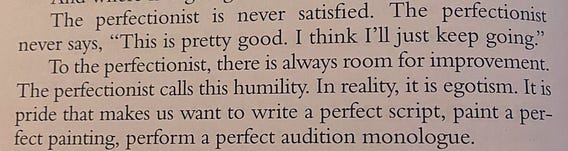 "The perfectionist is never satisfied...To the perfectionist, there is always room for improvement. The perfectionist calls this humility. In reality, it is egotism. It is pride that that makes us want to write a perfect script, paint a perfect painting, perform a perfect audition monologue."