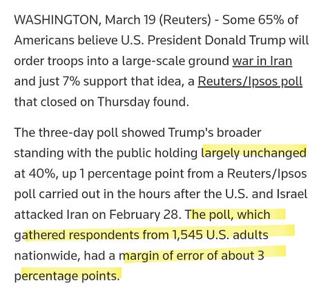 Second, the 3% margin of error means the results could differ by at least 6% outright.