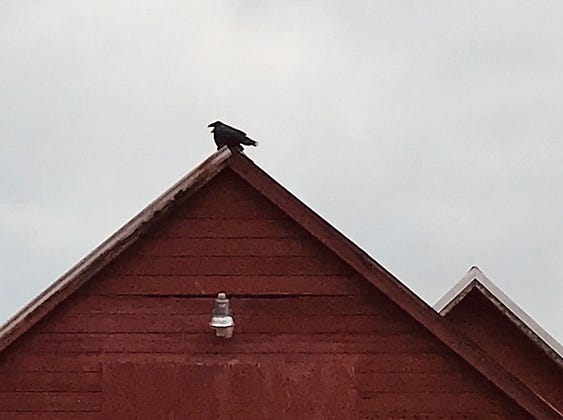 Two ravens on a roof in Alaska. They’re so close it looks like one bird, but there is a second one behind.
