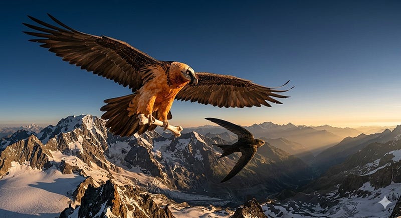 Me: A swift. Never lands — literally cannot walk on the ground. Sleeps on the wing, eats on the wing, exists entirely in motion and air. Dark, angular, faster than anything its size should be. Looks small beside the lammergeier but cuts through air with a precision that makes larger birds look clumsy. Follows thermals the vulture finds first.