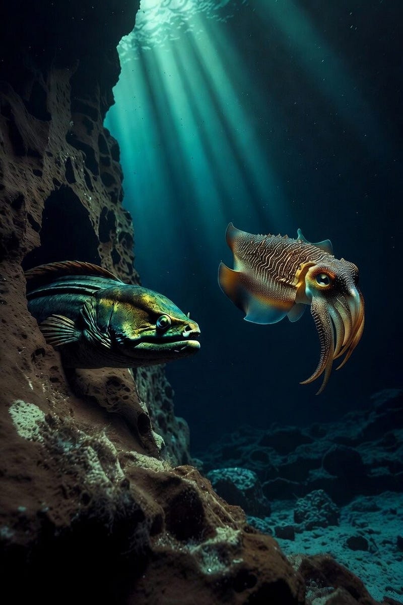 Why: She holds the territory and knows every crevice in the rock. I move through the water changing shape while reading the field. When something enters her territory I'm already repositioned before it knows I was there.