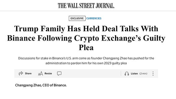 WSJ: Trump family in discussions to take an ownership stake in Binance, the world's largest (Chinese) crypto exchange and the recipient of the largest money laundering fine in American history - $4.3 billion, just last year after Binance admitted to having laundered money for all kinds of terrorist groups, ransomware gangs, and pedophile rings (the internal Binance DMs in the charging documents consisted of things like “c’mon, they are here for crime” and “$600? you can barely buy an AK for that” were hilarious and I encourage you to look into the reporting on the subject).