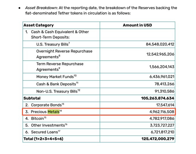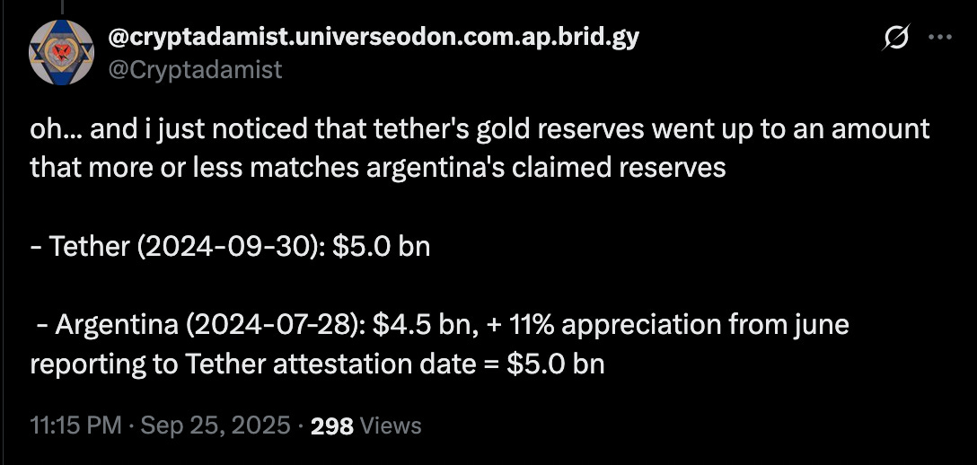 as of September 30th, 2024 both argentina and tether claimed to hold almost exactly the same amount of gold reserves (~$5.0 billion)
