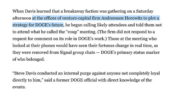 if you’re surprised by the fact that DOGE staff were having a meeting in the offices of Marc Andreessen’s crypto venture capital firm a16z you probably lack the information required to understand what has been going on in the american government this past year.