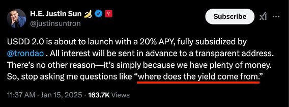 His Excellency Justin Sun, the biggest investor in Donald Trump's crypto project World Liberty Financial, is offering a guaranteed "risk free" 20% interest rate on his new algorithmic stablecoin that's quite literally modeled on the Terra/Luna algorithm (the big difference is that His Excellency's smart contract has a backdoor for him to steal all the money). He would prefer that you not ask him where the yield comes from.
