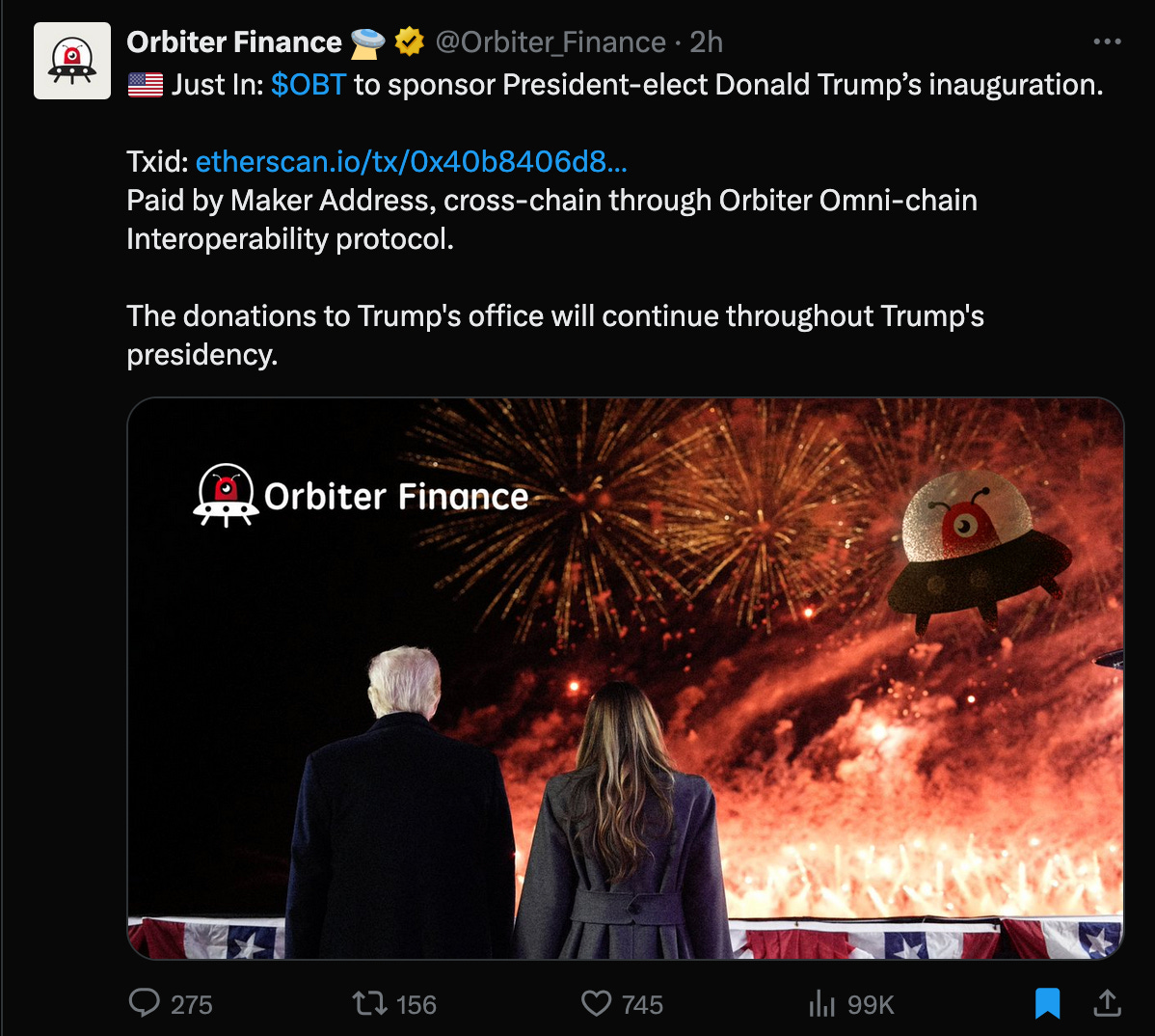 So a random Asian (Chinese?) crypto company Orbiter Finance company just announced they were donating to the Trump inauguration. These things happened: