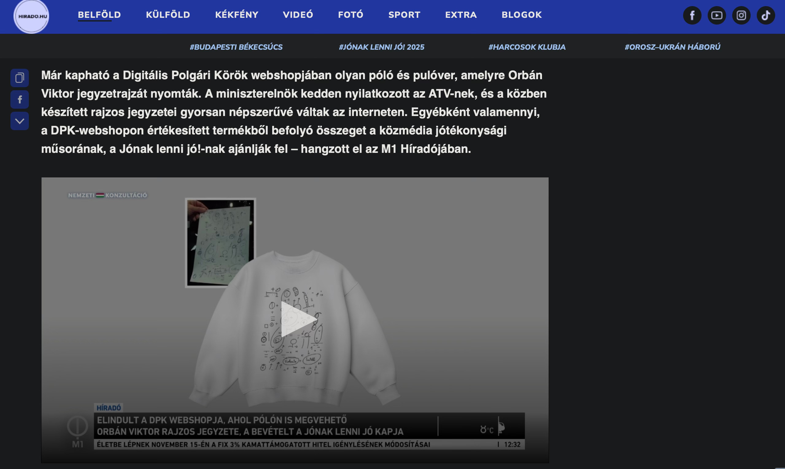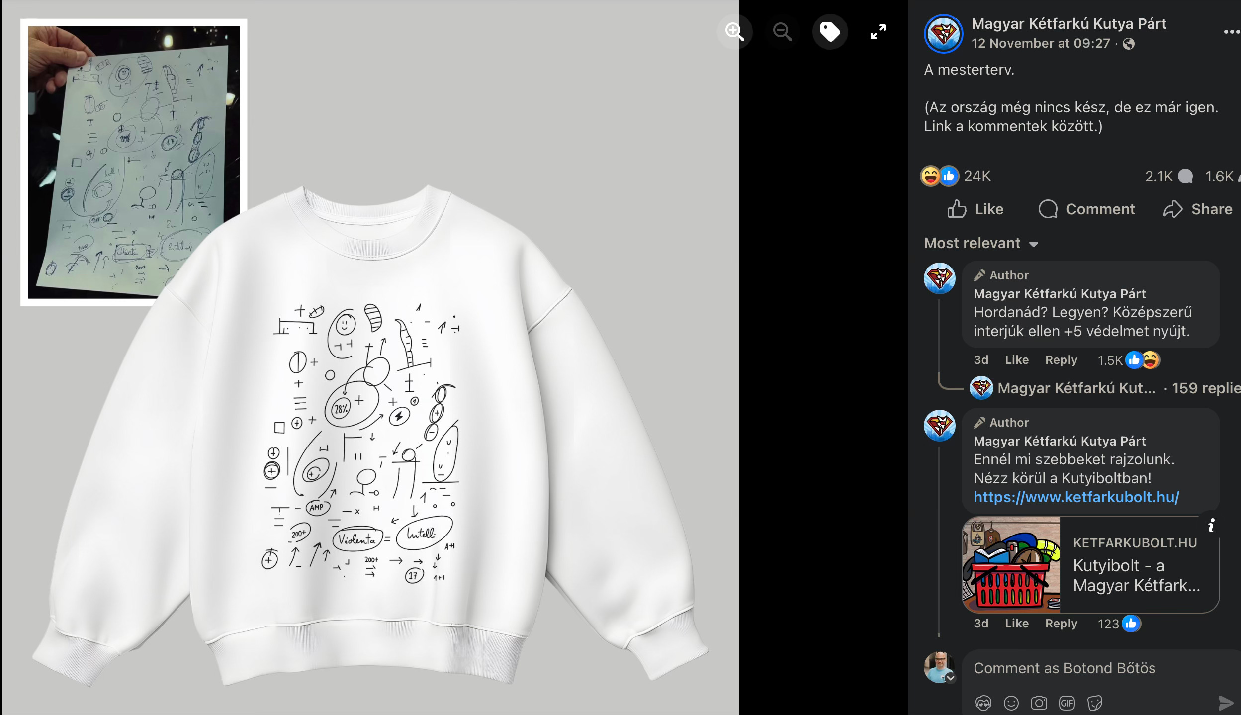 És mindössze 48 óra telt el a Kutyapárt legújabb mörcs-kampányának elindítása óta, és 2025. november 14-től már a Digitális Polgári Körök webshopjában is kapható ugyanolyan pulóver, amelyre Orbán Viktor jegyzetrajzát nyomták. A maffiaállam hivatalos propaganda-elmesélése szerint azért, mert az ábra úgymond “elterjedt az interneten.”