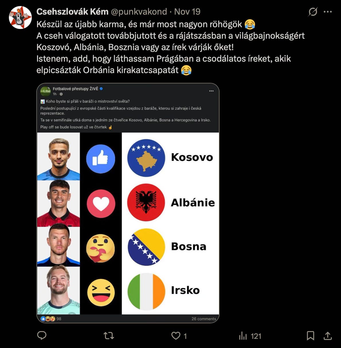 Két nappal ezelőtt fordultam az ég felé és összekulcsolt kezekkel kértem az X-en a magyarok jóistenkéjét, hogy adja meg a közép-európai kozmopolita futballdrukker aktuálisan legnagyobb kívánságát, és hozza el nekem 2026 márciusában Prágába a Budapesten csodát művelő ír nemzeti tizenegyet!
