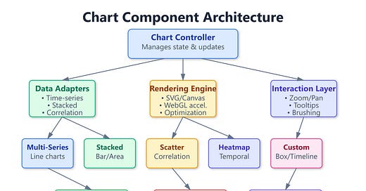 Today we’re creating production-grade chart components that handle complex data visualization scenarios: multi-series time-series charts tracking system metrics across multiple servers, stacked bar charts showing resource distribution, scatter plots revealing correlation patterns, and heatmaps displaying temporal patterns. Think Netflix’s real-time stream quality dashboard showing buffering rates across 50+ CDN nodes, or Datadog’s APM interface correlating latency with error rates across microservices.