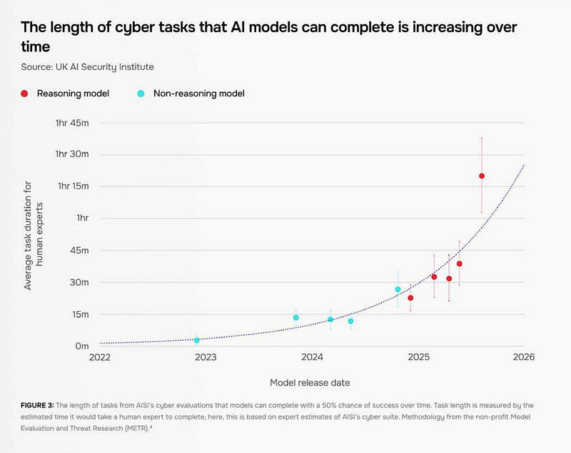 The UK's AI Security Institute found that the length of tasks that AIs could do is doubling roughly every 8 months. That’s actually an upper bound; it could be even faster. They estimated this after testing different AIs on vulnerability discovery/exploitation, malware-development, CTF challenges, and more. Unassisted task lengths went from less than 10 minutes in early 2023 to over an hour by mid 2025.