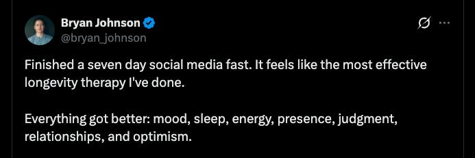 Bryan Johnson this is awesome to see, I’d challenge you to do all media next—including reading, videos, music, podcasts, and so-on. Just that good gooooood Empty Brain Time.