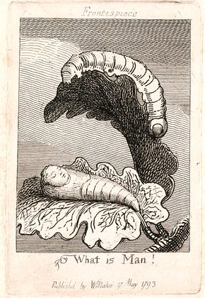 This particular plate may be intended as a representation of the beginning of life. Man is here being likened to a caterpillar, emerging from a chrysalis. What might be the symbolism here? Transformation? Resurrection? Insignificance? There are no clear answers.