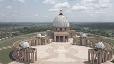 The Basilica of Our Lady of Peace in Yamoussoukro, Ivory Coast is one of the largest churches ever built, rising over 150 meters and capable of holding 18,000 people, deliberately surpassing St. Peter’s in Rome.