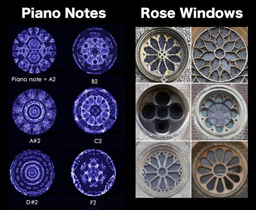 As Pythagoras had found harmony in the mathematical order of music, geometry could produce visual harmony. Music and visual beauty were bound by the same divine forces — notice the similarity of vibrations of musical notes in water and rose windows, for example.