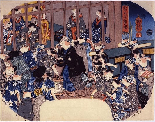 This ukiyo-e print by Utagawa Kuniyoshi (1846) is titled 'Hazy Moon Cats' or alternatively 'Pale Moon, Cats in Season' and depicts cats as courtesans in the Yoshiwara pleasure district. At the time, depicting prostitutes in artwork was prohibited so Kuniyoshi, who was an avid cat lover, created the scene with cats rather than humans.