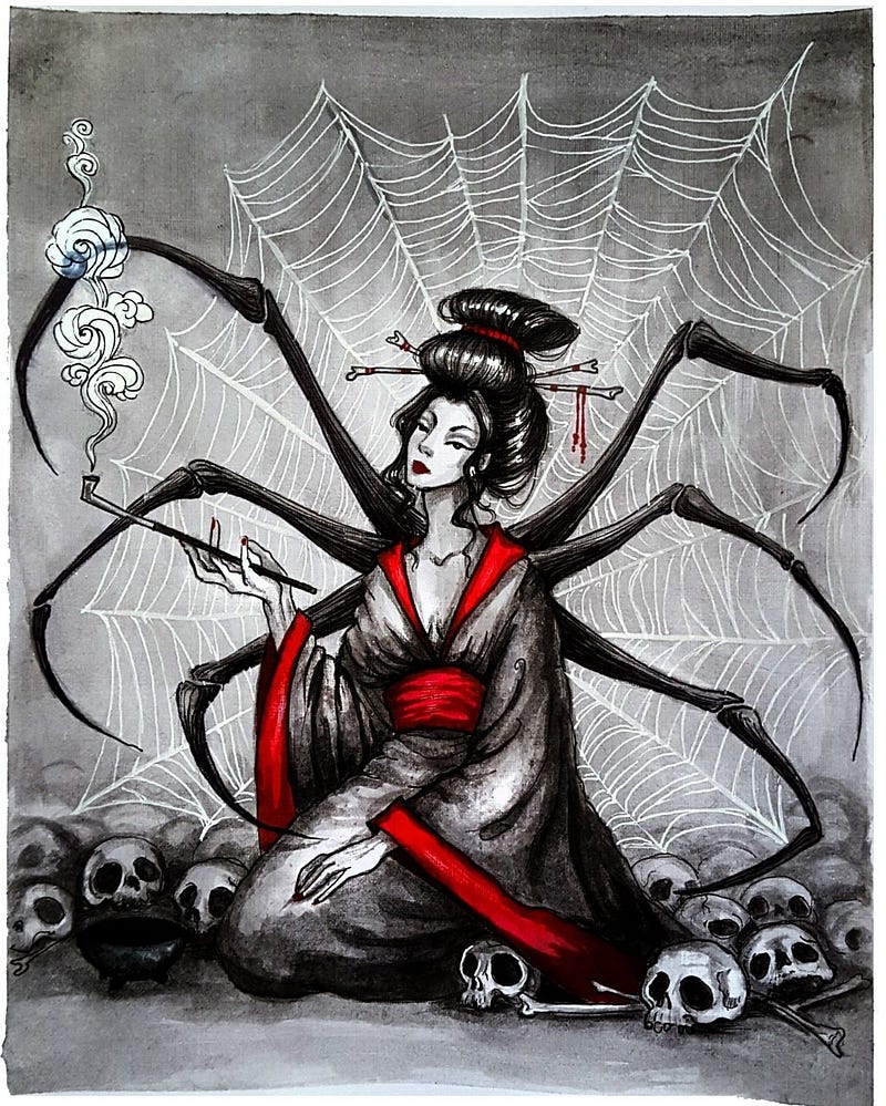 In Japanese folklore jorogumo is a spider yokai that feeds on humans. When regular golden orb spiders reach 400 years of age they develop supernatural powers including the ability to shapeshift. In order to obtain humans to eat, they will often take the form of beautiful women in order to seduce unsuspecting male victims. She will lure the men to her home only to trap them in her powerful web. Jorogumo use their toxic venom to poison their victims, then enjoy watching them slowly die. Over time jorogumo can amass piles of human bones without anyone suspecting a thing. They also have the ability to control other spiders, including fire-breathing spiders, which they command to burn down the houses of anyone who might be suspicious of their actions. Sometimes jorogumo are nushi (guardian spirits) of ponds. I’ve written about nushi in my most recent post if you'd like to read more.