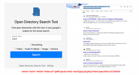A simple online tool that generates queries to Google to search for audio, video, ebooks and archives in open directories on different servers.