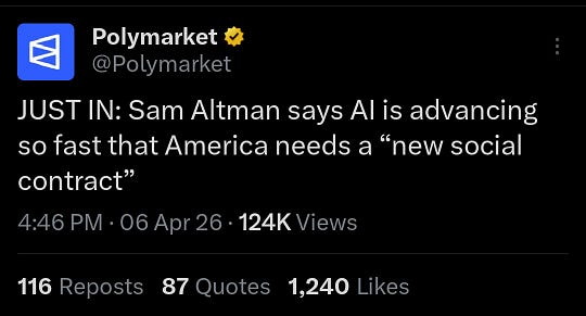 A social contract is a way of slowing down the inevitable acceleration. Sam Altman is not an accelerationist. He is actually there to ensure AI doesn't reach escape velocity too soon.