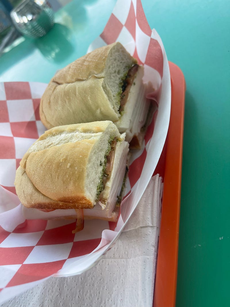 Deli sliced turkey, pesto, tomato, mozzarella, balsamic drizzle on a hoagie