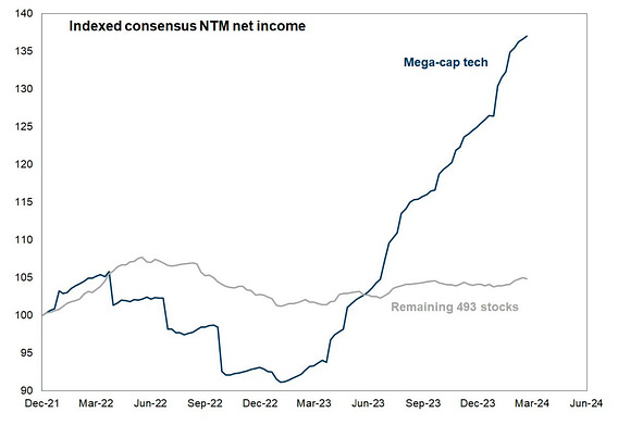 The gap in expected NTM net income between mega-cap tech and the bottom 493 of the S&P is widening.