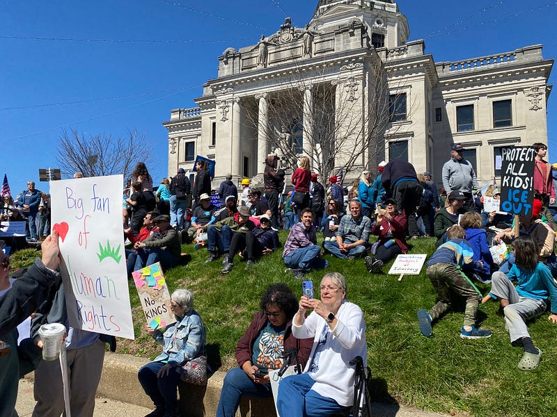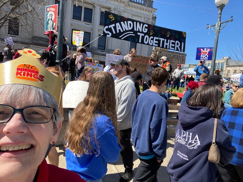 My Burger -King-No-Kings crown and me standing together with my neighbors during The No Kings protest. Glad to be part of over 60 protests against The Mad King in very red Indiana.