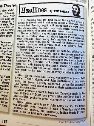 Fascinating 1969 clipping included in Richard Morton Jack’s amazing book Led Zeppelin: The Only Way To Fly, in which the Honolulu Advertiser reviewer seems more concerned about Robert Plant’s “almost feminine” appearance onstage than the proper spelling of “Eric Clampton” or “Rod Steward”.