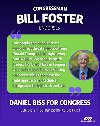 Congressman Bill Foster knows better than anyone the existential threat of climate change and the very real damage Donald Trump is doing to our healthcare system and economy. I am thankful to have his support in this race.