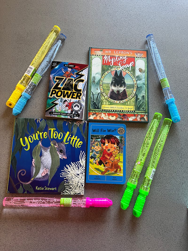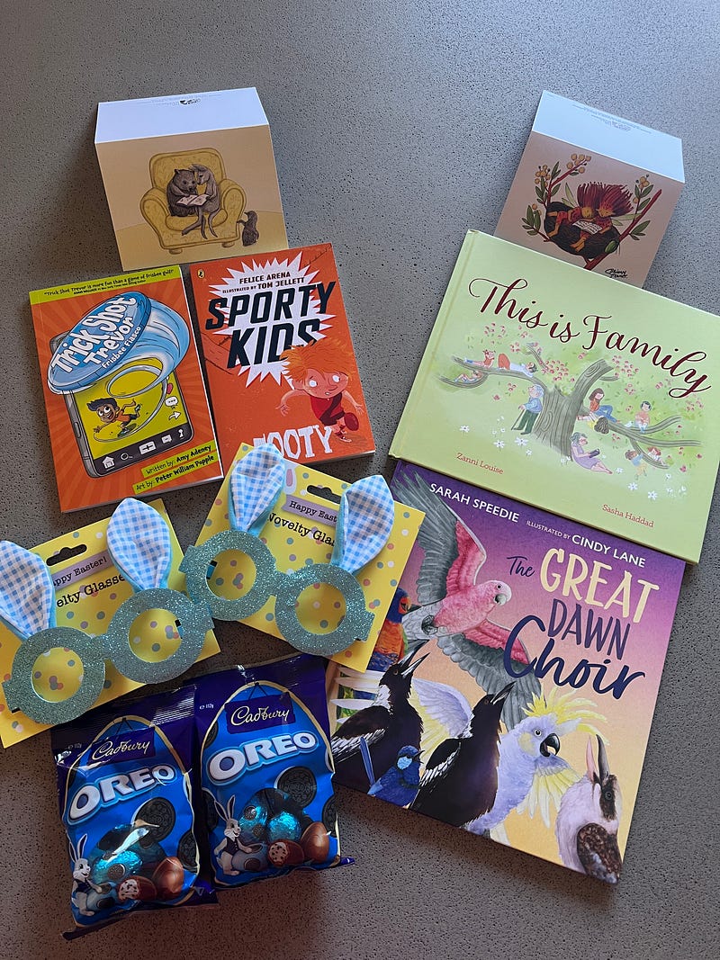 All the Aunty Easter gifts I’m giving. For five children, aged 1—6 and some who are not chocolate fans (!) so I’ve gone for bubbles instead! Books, books, books gifted at every holiday opportunity ☺️