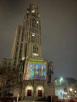 The Cathedral of Learning at the University of Pittsburgh clapped back HARD against Trump. 🤯 Displaying banners of the six Democratic veteran lawmakers he called 'traitors' and suggested for hanging. The message? "THIS IS WHAT COURAGE LOOKS LIKE."