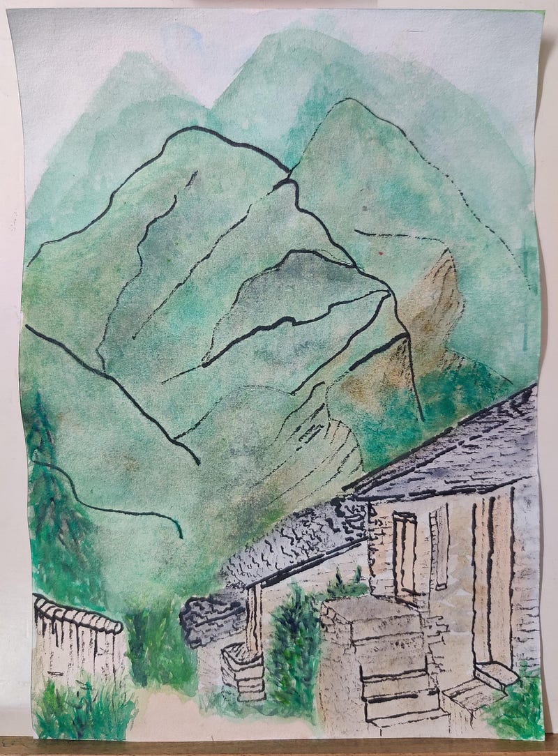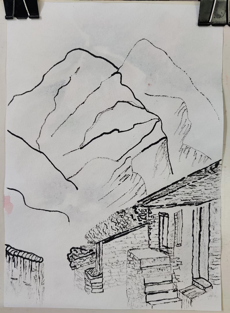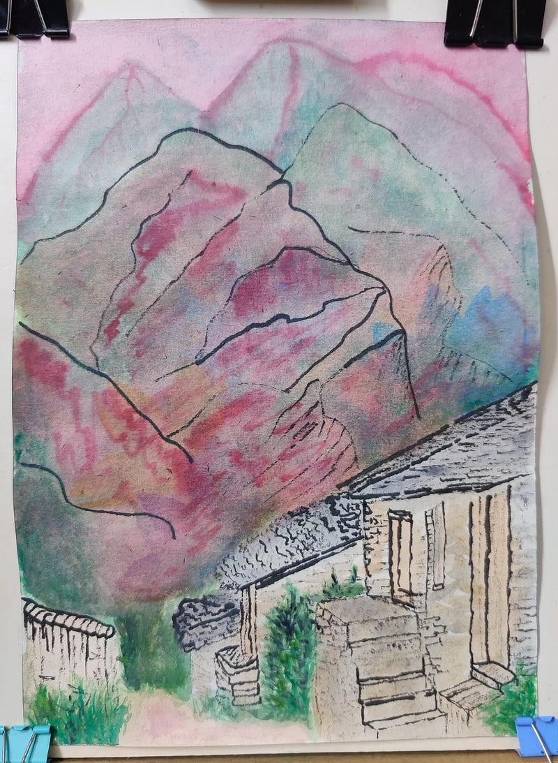 Red ink was added to create an effect that didn't work so red sky and mountains in the distance it is ๐