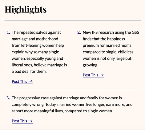 I went to the Institute of Family Studies website to read the full report, and was bugged by the framing of these highlights, which are set up for easy posting on X (no Bluesky button, my dudes?). Two of the three tweets are worded in opposition to “left-leaning women” or “progressives.” As I say on here all the time, plenty of left-leaning women are stably married, and there isn’t really a loud anti-marriage lobby among progressives (the chief “progressive” villain in this report is Elizabeth Gilbert of Eat, Pray, Love fame, who is far from a representative voice, and also not a political figure in any way). Why not try to create bipartisan goodwill for marriage and problem-solve to remove barriers to it? For example, generous maternity and paternity leaves are marriage-promoting policies that we could get both parties behnd!