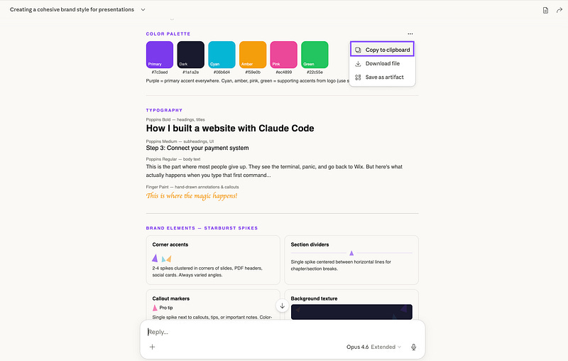 This one's from my brand skill. Claude made a full style guide: colors, typography, brand elements etc. Now all my docs and presentations stay on brand.