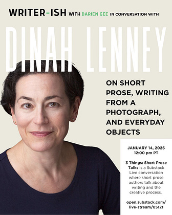 We’ll start the 2025 series with Dinah Lenney on January 14, 2025 at 12:00 pm PT, here on Substack Live. We’ll be in conversation about writing from a photograph, everyday objects, and what it means to write short. Looking forward to seeing you then!