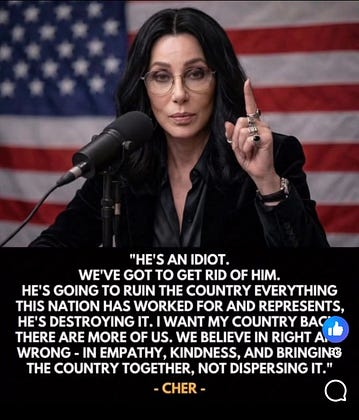 Thank you Cher for rallying people to fight back for our democracy and the survival of America. The president and his administration have to be stopped and held accountable.