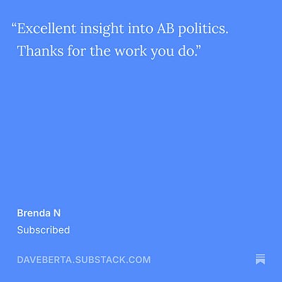 👋 I just want to take a moment to sincerely thank everyone who reads and subscribes to Daveberta. I’ve been writing about Alberta politics for 20 years now and it continues to be a huge honour share my thoughts and have so many of you read, share and send feedback about it. Thank you so much. ðŸ¤