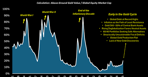 Historical cycles suggest gold is in an early phase of outperformance relative to global stocks.