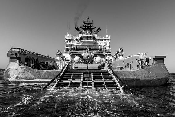 The submersible Titan getting ready to launch on its first dive to the Titanic, July 3, 2021.