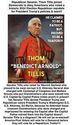 North Carolina Republican Senator, Thom Tillis, is a disgrace and a Traitor to the people who voted, contributed, knocked on doors and fought hard to earn the Republican mandate they gave President Trump and the Republican Party!