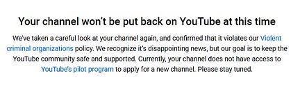 YouTube, the world's biggest platform, today decided to delete my channel. Appeal denied. The suppression of my career continues.