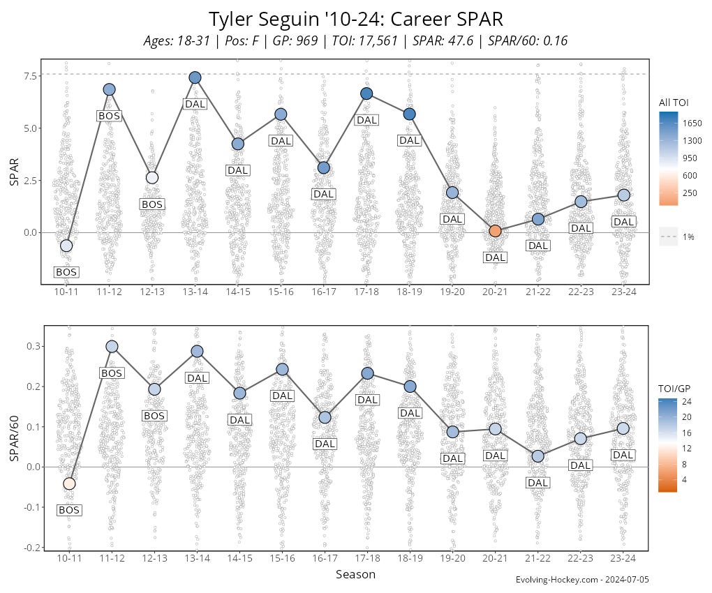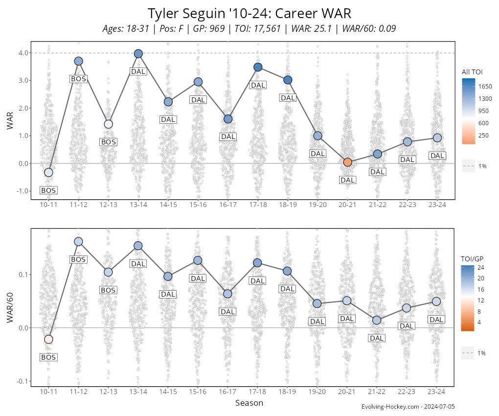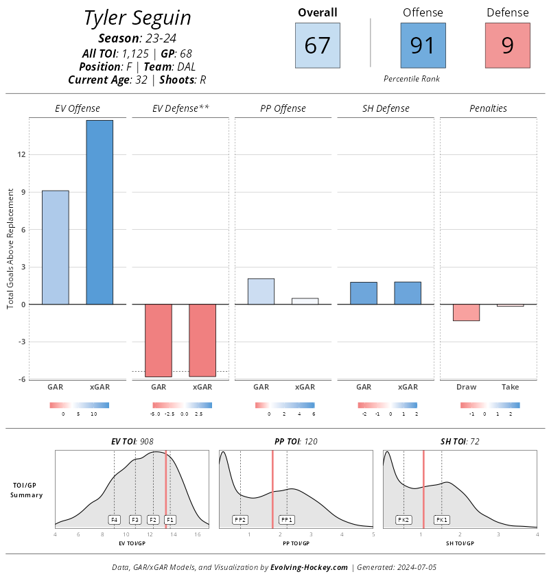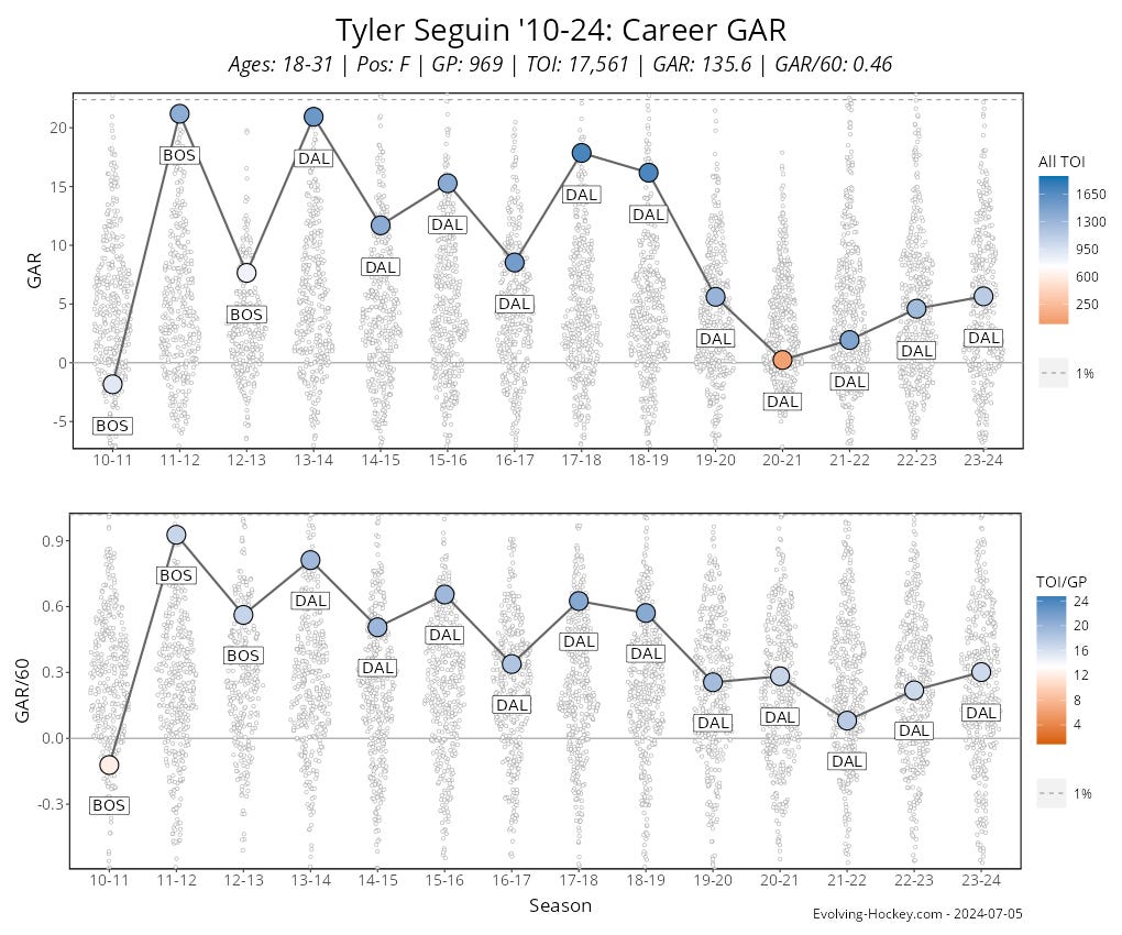 Attached are various GAR charts for Tyler Seguin, shown in goals, wins, standing points, and percentile.