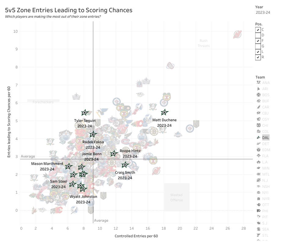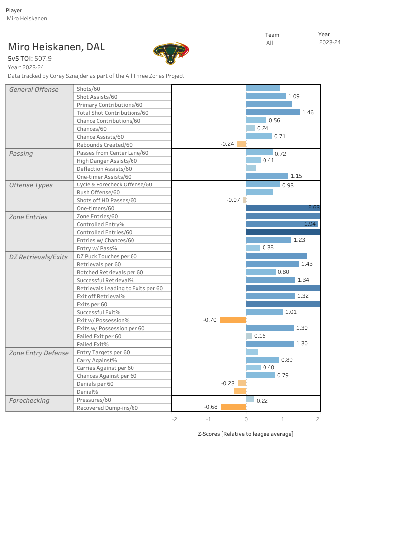 Personal note: if you're looking to be an amateur analyst, or are an aspiring hockey writer, Corey's data should be mandatory IMO. So much of explaining what we see, or how teams perform or not depends on understanding performance itself. Corey's data gives you the most intimate insights into player and team performance. A single card won't tell the whole story, but it can give you a new appreciation for players you’re used to watching from a different point of view. Or, as with Dallas — insight into fascinating contradictions (in this case, how does such a great goal-scoring team end up being so wasteful in terms of chances created?). I also think his player cards are the best way to analyze defensemen, since the scope of their duties go far beyond simply shot differential. It’s no wonder, when he did his own analysis of the most repeatable transition skills, that players like Miro Heiskanen and Chris Tanev rated the highest.