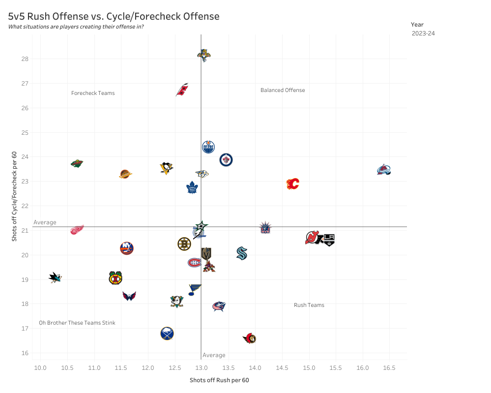Offense types are broken up by the chances a player creates from the rush, on the forecheck, off rebounds, etc. What does this say about a player? Rush chances convert at a higher rate, in keeping with the famous Jen LC stat that 64 of all goals are scored off controlled entries. However, there are more shots that result from forechecking, thus players who are good at creating on the cycle are also more likely to be strong possession players.