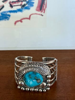When my dad was in his late 30s, running the welding shop for Disney in Burbank, he started teaching himself the art of making turquoise & silver jewelry. As a British immigrant he loved and studied Native American jewelry. He had a great respect for Native American history as well. On our last trip home, this Christmas, my almost 90 year old mom found me alone, one evening, in the bedroom and with shaky hands told me this first cuff he made for her was mine now 😭 Together we have a beautiful collection.