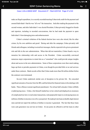 Cohen’s sentencing agreement…no coercion here…he took money illegally before,after election. Made 4 million dollars before contracts “were terminated.” MC was as “deceptive in private life as he was in campaign.”