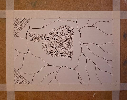Experimenting with a dip pen and ink that I forgot I had, and it's really wonderful to realise how delicate and free my mark making has become. A year ago, I would have pressed so hard I would have broken the nib because that's what I was taught - you always have to try harder, and for the best part of my life, I took that literally. I put so much tension and physical force into everything I did, that I was not only damaging my tools, but my body as well.
