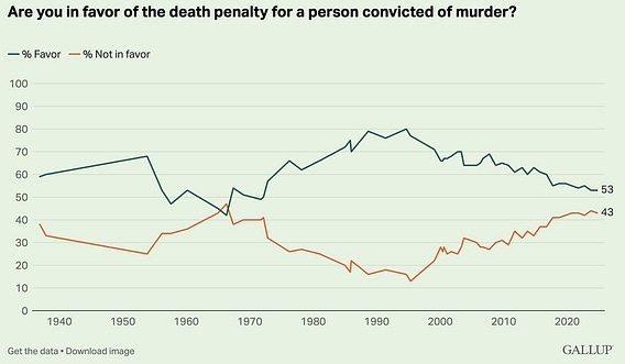 Conservatives claim that there is more crime than ever before, and it is being hidden by advances in medical science. But if we take “support for the death penalty” as a proxy for the crime rate, then this seems unlikely.